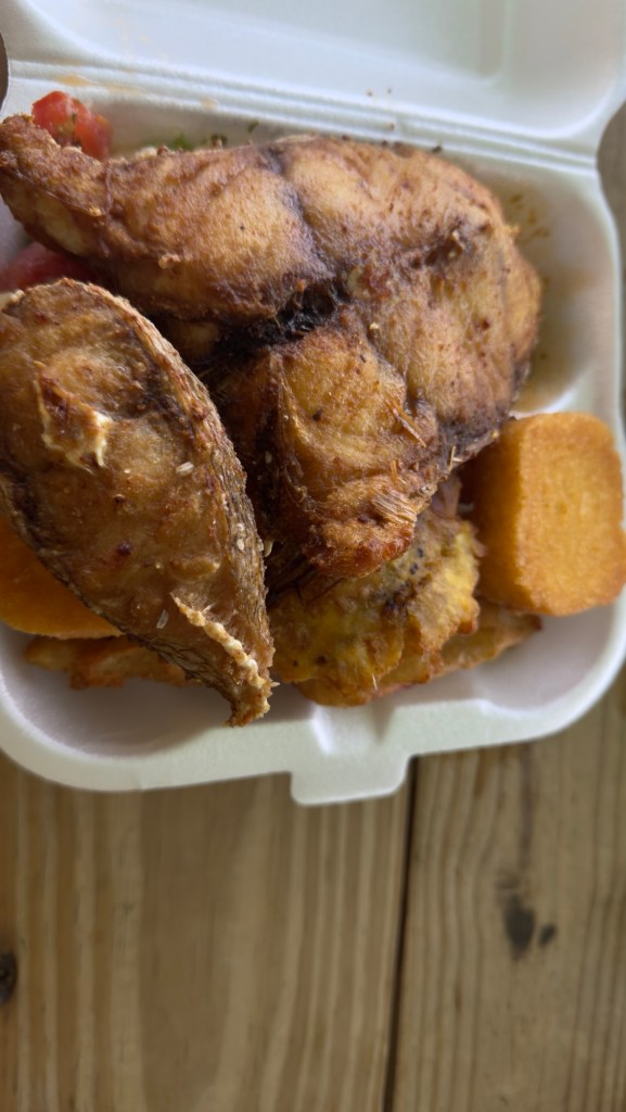 Fried snapper, plantains, and fried polenta, at Bigeye Scad.